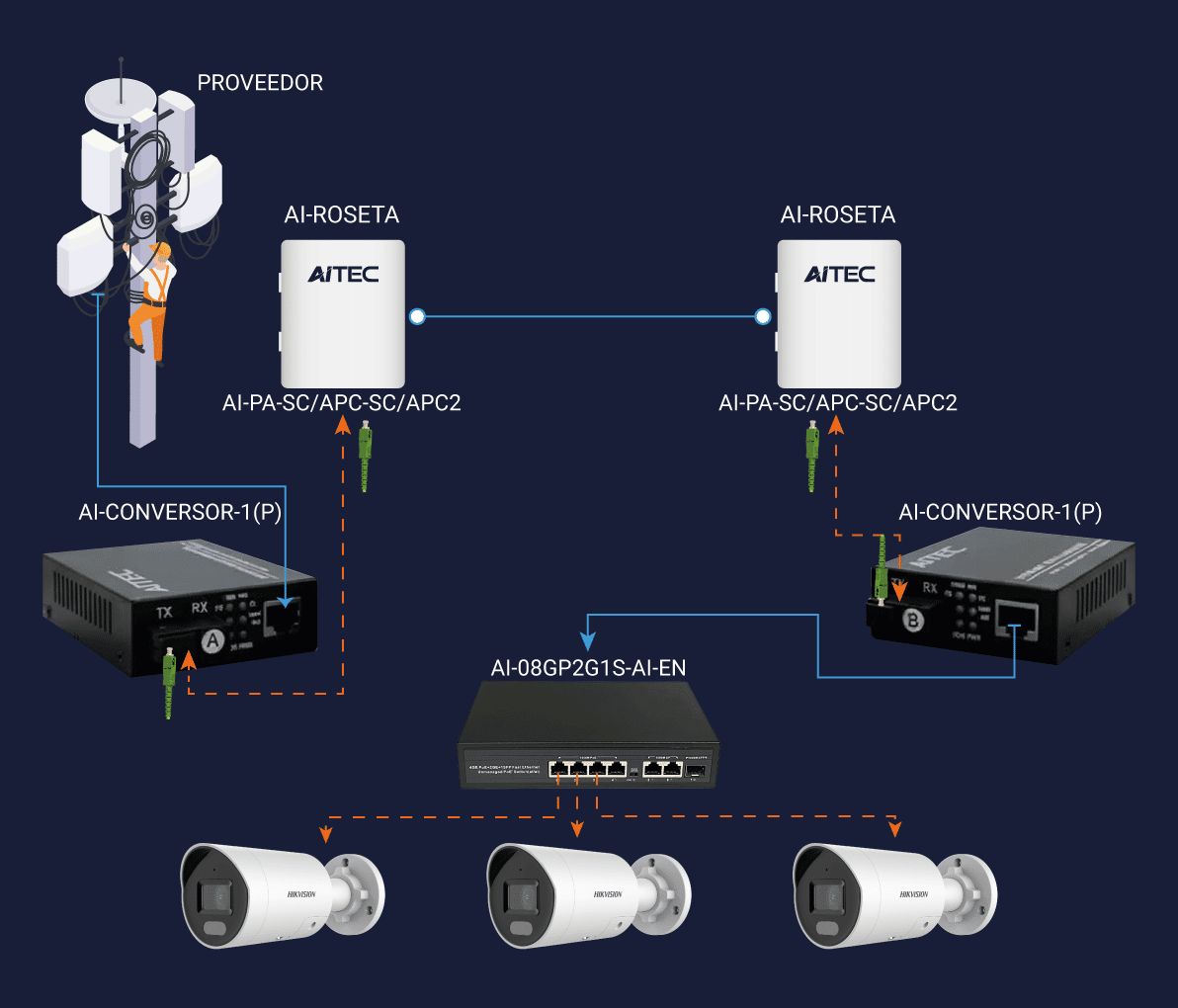 Kit completo de transmisión de datos para distancias extendidas. Permite convertir señales Ethernet a fibra óptica con alta eficiencia y baja latencia.