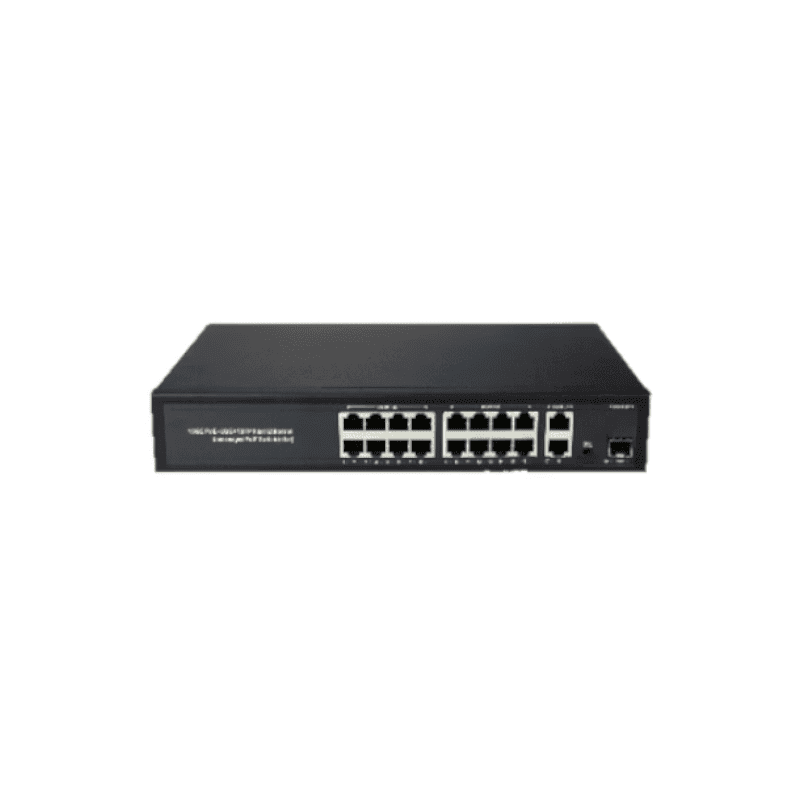 - Configuración: 16 puertos PoE Gigabit + 2 uplink 1000M + 1 SFP.